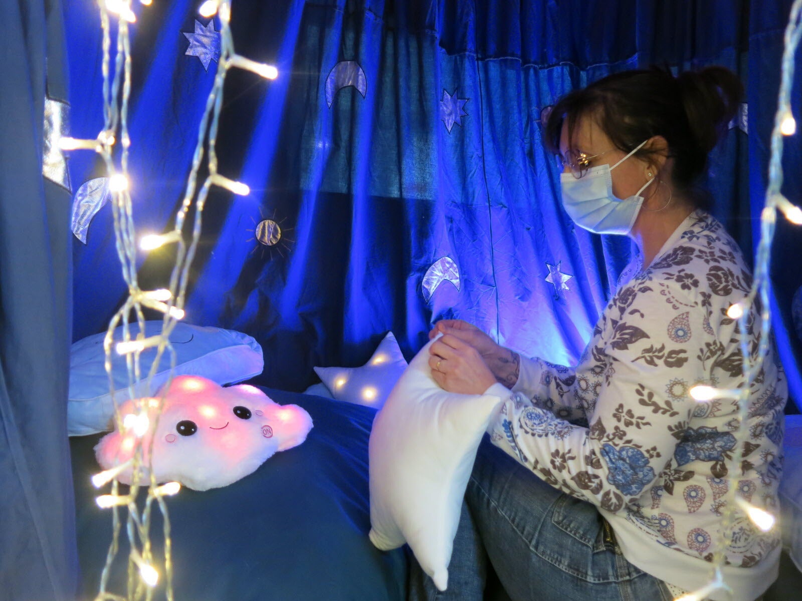 L’activité Snoezelen est une activité de plaisir et de bien-être orientée vers la perception sensorielle par le biais de la lumière, du son, du toucher, de l’odorat, du goût. » dans un espace dédié particulier pour tous.
